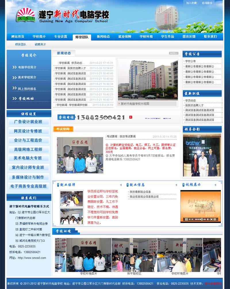 摘要:遂寧市新時(shí)代電腦學(xué)校已建校十余年,由市勞動(dòng)局批準成立,是唯一獲得國家扶貧學(xué)款的專(zhuān)業(yè)電腦學(xué)校。屬川中地區辦學(xué)最早、規模最大、師資最強、收費最低、就業(yè)率為100%的專(zhuān)業(yè)電腦學(xué)校。一直以來(lái),學(xué)校注重教學(xué)質(zhì)量、嚴格管理,輸送到全國各地的網(wǎng)絡(luò )公司、廣告公司、游戲公司、電視臺、影視公司及各行政企業(yè)單位的三萬(wàn)余名IT專(zhuān)業(yè)人才,以技術(shù)高、素質(zhì)好,深受社會(huì )各界好評。學(xué)校連續多年被評為優(yōu)秀辦學(xué)單位,電腦竟賽技能標兵、四川省優(yōu)秀人才輸送基地等榮譽(yù)稱(chēng)號。市電視臺教育欄目、省公共頻道、安居電視臺、船山電視臺、廣播電視臺、遂寧日報等各大媒體爭先相關(guān)報道。 ....
