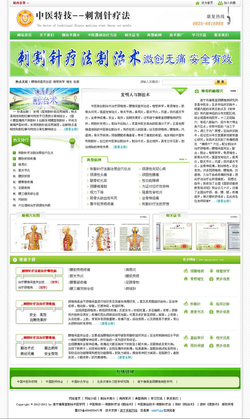 摘要:遂寧康骨堂頸腰椎病研究所,以研究頸椎病、腰椎病為己任,規范,科學(xué),發(fā)展中醫微創(chuàng )松解減壓新技術(shù)《刺割針療法》,為人類(lèi)健康事業(yè)做貢獻!遂寧《康骨堂》自主創(chuàng )新發(fā)明中醫微創(chuàng )技術(shù)---刺割針療法《割治術(shù)》,由初創(chuàng )到系統化,由自主創(chuàng )新發(fā)明到取得國家知識產(chǎn)權局授予“發(fā)明”專(zhuān)利,由《康骨堂》用于頸椎病、腰椎病臨床研究,到正式騙入《中國民族醫藥特色診療技術(shù)》,中國中醫藥出版社出版,在國內外公開(kāi)發(fā)行,作為中國民族醫藥學(xué)會(huì )教育研究分會(huì )開(kāi)展國家級繼續教育培訓項目的指定教材,為全國各民族健康事業(yè)做貢獻,刺割針療法這個(gè)原創(chuàng )性小發(fā)明,經(jīng)過(guò)近30年反復摸索,觀(guān)察和潛心研究....